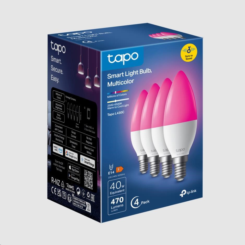 TP-Link Tapo L430C(4-pack) chytrá WiFi stmívatelná LED žárovka (barevná,2500K-6500K,470lm,2,4GHz,E14)