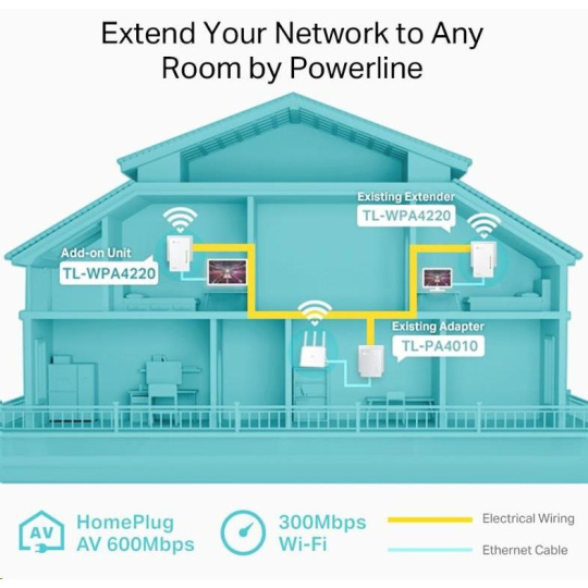 TL-WPA4220 přemění vaši stávající elektrickou síť na vysokorychlostní internetovou síť bez nutnosti dalších kabelů či vrtání. Rozšiřující jednotka TL-WPA4220 podporuje sofistikovaný standard HomePlug AV2 a je perfektním řešením pro rozšíření existující sítě vedené přes elektrické rozvody. Poskytuje spolehlivé a vysokorychlostní datové přenosy až 600 Mbit/s přes vedení dlouhé až 300 metrů a současně propojuje kabelovou a bezdrátovou síť všude tam, kde je k dispozici elektrická zásuvka.