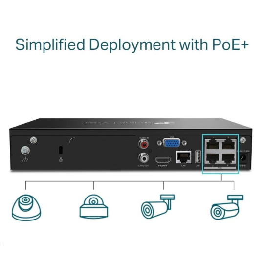 TP-Link VIGI NVR1004H-4P-2TB, videorekordér, 4 channels, 4xPoE, 1xSATA, 1x100Mb/s LAN, 2xUSB2.0, 1xHDMI,1xVGA