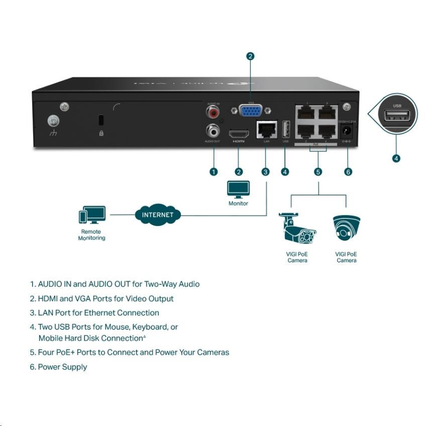 - Vzdálené monitorování - Vyhrazená aplikace VIGI, webové uživatelské rozhraní a VIGI Security Manager umožňují vzdálené monitorování.