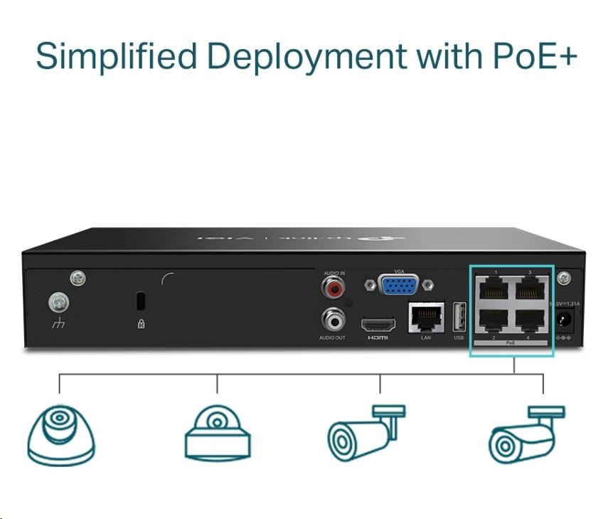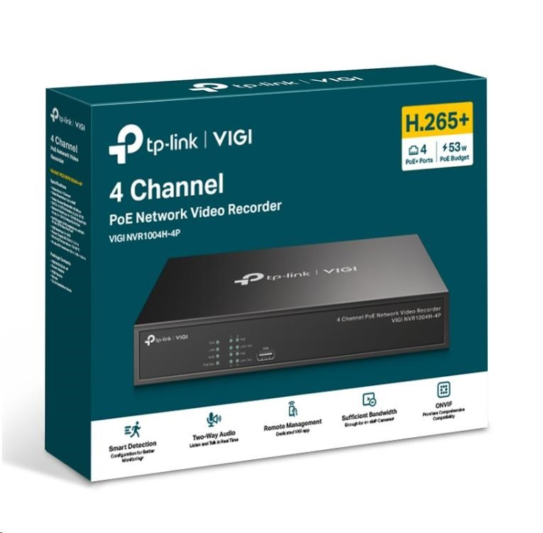 TP-Link VIGI NVR1004H-4P, videorekordér, 4 channels, 4xPoE, 1xSATA, 1x100Mb/s LAN, 2xUSB2.0, 1xHDMI,1xVGA