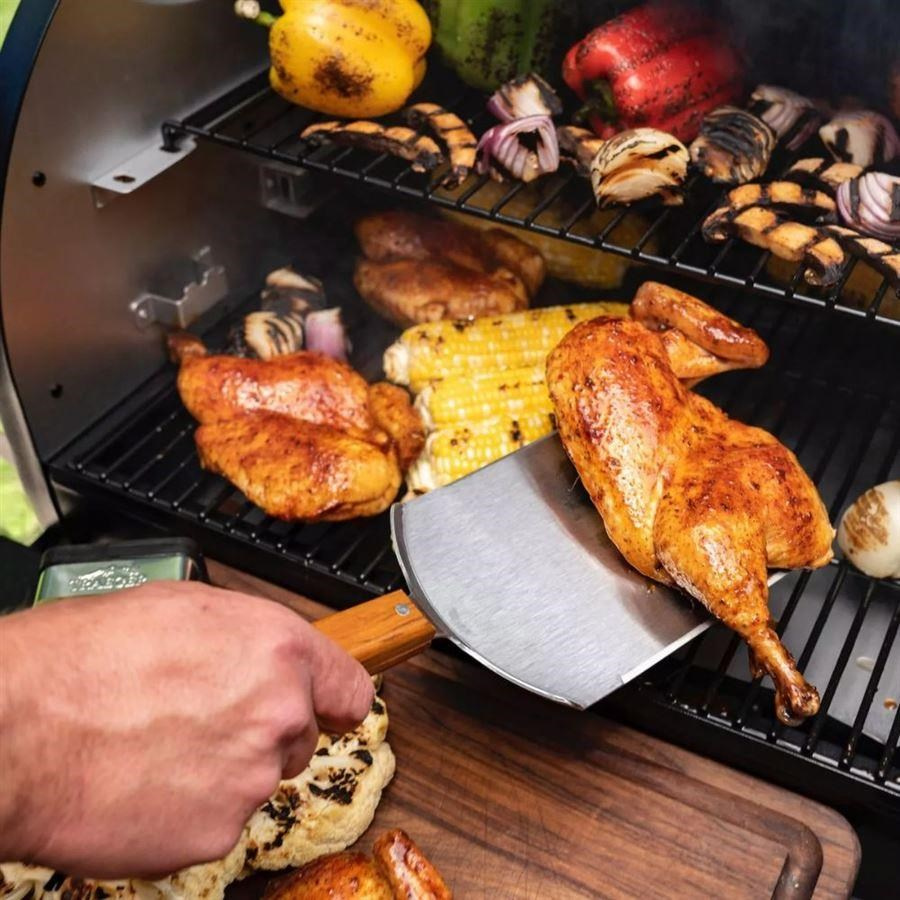 Když potřebujete přenést velký kus hovězího hrudí nebo celou stranu lososa, potřebujete špachtli Traeger XXL BBQ Spatula. Díky velkému povrchu a robustní rukojeti se na ni můžete spolehnout při přenášení i těch největších kusů masa a ryb.