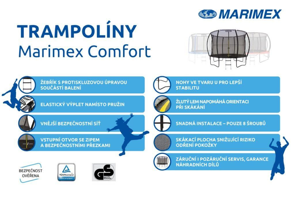 Bezpružinová trampolína Marimex Comfort je výjimečná díky nové technologii upevnění skákací plochy do rámu. Elastický výplet namísto pružin je bezpečnější, zvyšuje flexibilitu odrazové plochy a způsobuje měkčí dopad. Orientaci při skákání napomáhá žlutý lem na odrazové ploše. Bezpečnostní síť na vnější straně trampolíny je pružná a zároveň výborně drží tvar. Instalace kovové konstrukce i sítě je velmi snadná, čítá pouze 16 šroubů. Dokonalou stabilitu zajišťují 4 nohy ve tvaru písmene U. Výhody trampolín Marimex Comfort Elastický výplet namísto pružin - bezpečný systém a měkčí dopad Snadná instalace - pouze 16 šroubů Žlutý lem - napomáhá orientaci při skákání Odrazová plocha Materiál odrazové plochy patří k nejkvalitnějším na trhu. Plocha je vyrobena ze speciálního polypropylenu s ochranou proti UV záření, který zaručuje dlouhou životnost. Speciální neabrazivní (hladká) povrchová úprava zabrání odření kůže při dopadu. Vnější ochranná síť Ochrannou síť najdete přímo v balení, nemusíte si ji dokupovat zvlášť. Ochranná síť na vnější straně trampolíny je pružná a zároveň výborně drží tvar. Tyče jsou obaleny ochranným návlekem z měkčené pěny. Nohy trampolíny jsou samostatné a zvyšují stabilitu celé trampolíny. Zvenku i zevnitř jsou galvanizované trubky rámu. Parametry ochranné sítě materiál - polyester, černá průměr ochranné sítě - 366 cm výška ochranné sítě - 180 cm průměr tyče ochranné sítě - 25,4 mm tloušťka tyče ochranné sítě - 1,2 mm tloušťka trubky rámu: 38 x 1,5 mm tloušťka krytu rámu: 13 mm návlek tyče ochranné sítě - měkčená pěna vrchní obruč ochranné sítě - sklolaminátová tyč Materiál a složení ochranných prvků Trubky a stojny: pozinkovaná ocel Skákací plocha: PP (polypropylen) Ochranná síť: PE (polyethylen) Ochranný lem skákací plochy: EPE (expandable polyethylene) + vnitřní výstelka: PE (polyethylen) Bezpečnost Trampolíny jsou určené pro náročné pohybové aktivity, proto klademe důraz na jejich bezpečnost a spolehlivost. Použití kvalitních materiálů a moderních technologií při výrobě řadí naše trampolíny mezi nejbezpečnější a nejspolehlivější na českém trhu. K tomuto produktu doporučujeme dokoupit položku 19000730 - Sada kotvící s kovovou sponou (3 ks vrtáků)-trampolína. Rozměry trampolíny Průměr trampolíny: 366 cm Průměr skákací plochy: 312 cm Výška skákací plochy: 82 cm Výška včetně ochranné sítě: 265 cm Max. zatížení: 150 kg Počet nohou: 4 Parametry ochranné sítě Materiál: Polyester, černá Průměr ochranné sítě: 366 cm Výška ochranné sítě: 180 cm Průměr tyče ochranné sítě: 25,4 mm Tloušťka tyče ochranné sítě: 1,2 mm Návlek tyče ochranné sítě: Měkčená pěna Vrchní obruč ochranné sítě: Sklolaminátová tyč Parametry trampolíny Počet tyčí: 8 Ochranná síť vrchní: Ano Ochranná síť spodní: Ne Žebřík: Ano Logistické údaje Počet kartonů: 2 Rozměry a váha balíku: 148 x 44 x 33 cm, 47,10 kg 116 x 40 x 22 cm; 22,80 kg Odhadovaná doba montáže: 90 minut.