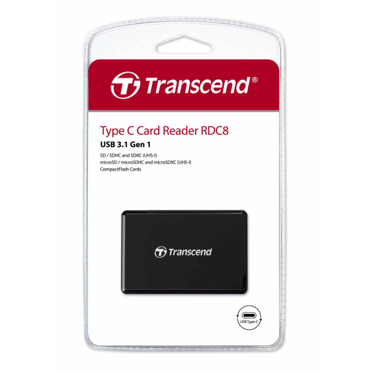 Transcend's RDC8 card reader is equipped with four slots for SD memory cards, microSD memory cards, CompactFlash cards, and Memory Stick memory cards, offering you a convenient way to transfer different types of digital files with one compact card reader.