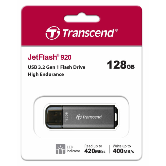 Introducing Transcend's high endurance, high performance JetFlash 920, a USB flash drive that is anything but ordinary. Boasting sensational read speeds of up to 420MB/s and write speeds of up to 400MB/s, the JetFlash 920 delivers top-notch performance in a sleek and portable design. Its aluminum metallic housing will safeguard your data wherever you go.
