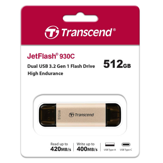 With 3D NAND flash and a USB 3.2 Gen1 interface, Transcend's JetFlash 930C flash drive offers advanced technology translating into top performance of 420MB/s read and 400MB/s write speeds. This high-endurance drive has 10 times the lifespan of a regular 3D NAND flash. Move your gaming files in a flash!