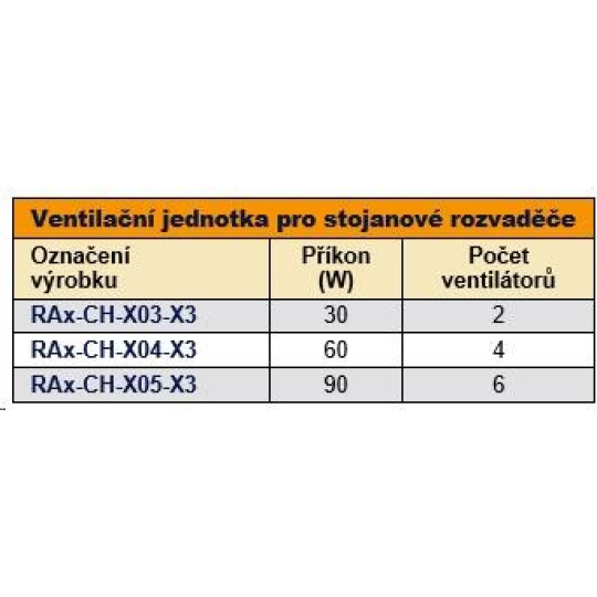 RAB-CH-Xxx-X3, RAC-CH-Xxx-X3 Tyto ventilační jednotky jsou zkonstruovány speciálně pro stojanové rozvaděče. Montují se podle potřeby do podlahy, čepice nebo dveří rozvaděčů. Ventilační jednotka pro stojanové rozvaděče – do čepice se instaluje z venkovní strany rozvaděče, do základny pak z vnitřní strany rozvaděče. Při instalaci do základny rozvaděče je nutno použít montážní rám spodní ventilační jednotky – RAx-CH-Xxx-X1, který se instaluje pomocí oboustranné lepící pásky. Dále doporučujeme pod rozvaděč podstavec pro nasávání vzduchu. Nastavení rozsahu teplot: bimetalový termostat Jmenovité napětí (V/Hz): 230/50-60.