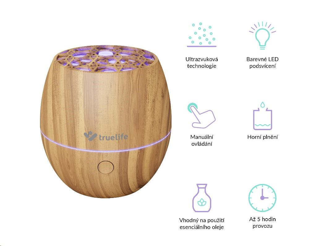 Chcete si doma navodit příjemnou atmosféru k józe či meditaci, nebo jen příjemně relaxovat? S aroma difuzérem Truelife si můžete naordinovat aromaterapii stiskem jednoho tlačítka. Stačí do nádržky s vodou přidat pár kapek vašeho oblíbeného esenciálního oleje a OilFlow® technologie se postará o zbytek. Difuzér eliminuje okolní pachy a provoní vzduch v místnosti vaší oblíbenou vůní. Můžete ho používat i jako zvlhčovač vzduchu. Funguje na principu ultrazvuku, vodu v nádrži mění na jemnou páru, která se mísí se vzduchem v místnosti a téměř okamžitě jej zvlhčuje na optimální hodnotu.
