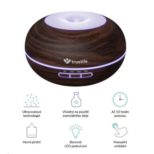 Stačí stisknutí jediného tlačítka a aroma difuzér Truelife provoní vzduch v místnosti vaší oblíbenou vůní. Vytvoří vám příjemnou atmosféru pro relaxaci, cvičení jógy nebo meditaci. Stačí do nádržky s vodou přidat pár kapek vašeho oblíbeného esenciálního oleje a OilFlow® technologie se postará o zbytek. Difuzér eliminuje okolní pachy a provoní vzduch v místnosti vaší oblíbenou vůní. Využijete ho i jako zvlhčovač vzduchu. Funguje na principu ultrazvuku, vodu v nádrži mění na jemnou páru, která se mísí se vzduchem v místnosti a téměř okamžitě jej zvlhčuje na optimální hodnotu.