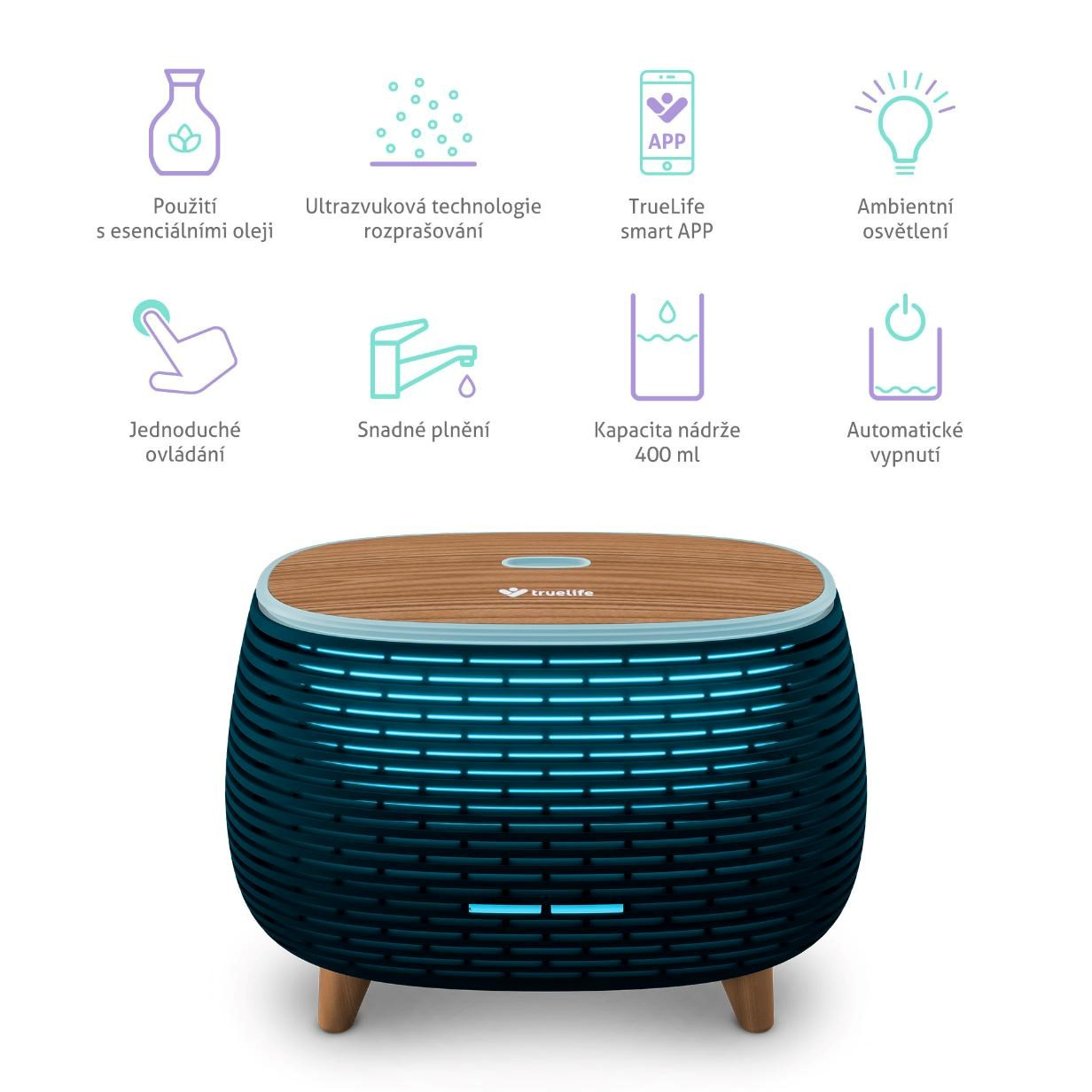 Difuzér lze propojit přes Wi-Fi s mobilní aplikací TrueLife Smart a jejím prostřednictvím ovládat.