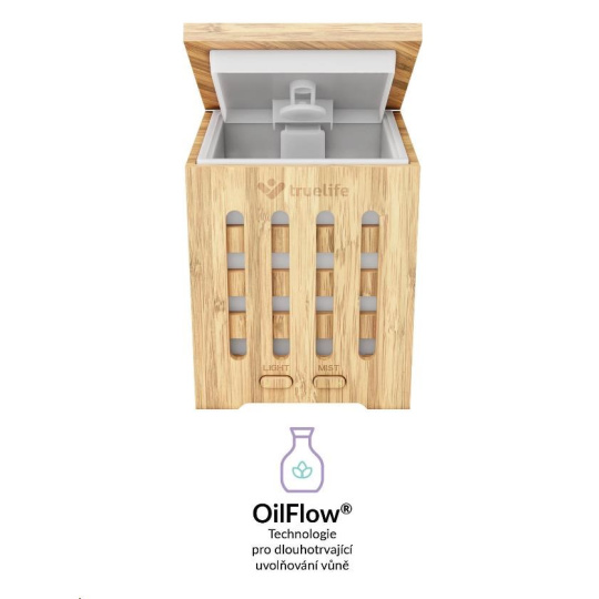 Difuzér Truelife vyrobený z bambusového dřeva provoní vzduch v místnosti vaší oblíbenou vůní během několika málo okamžiků. Na aromaterapii se už nemusíte objednávat, s pomocí difuzéru si vytvoříte atmosféru svých představ, ať se chystáte meditovat nebo jen příjemně relaxovat. Stačí do nádržky s vodou přidat pár kapek vašeho oblíbeného esenciálního oleje a OilFlow® technologie se postará o zbytek. Difuzér eliminuje okolní pachy a provoní vzduch v místnosti vaší oblíbenou vůní. Využijete ho ale i jako zvlhčovač vzduchu. Funguje na principu ultrazvuku, vodu v nádrži mění na jemnou páru, která se mísí se vzduchem v místnosti a téměř okamžitě jej zvlhčuje na optimální hodnotu.