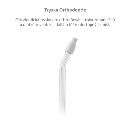 Ortodontická tryska pro odstraňování plaku ze zámečků a drátků rovnátek a dalších těžko dostupných míst.