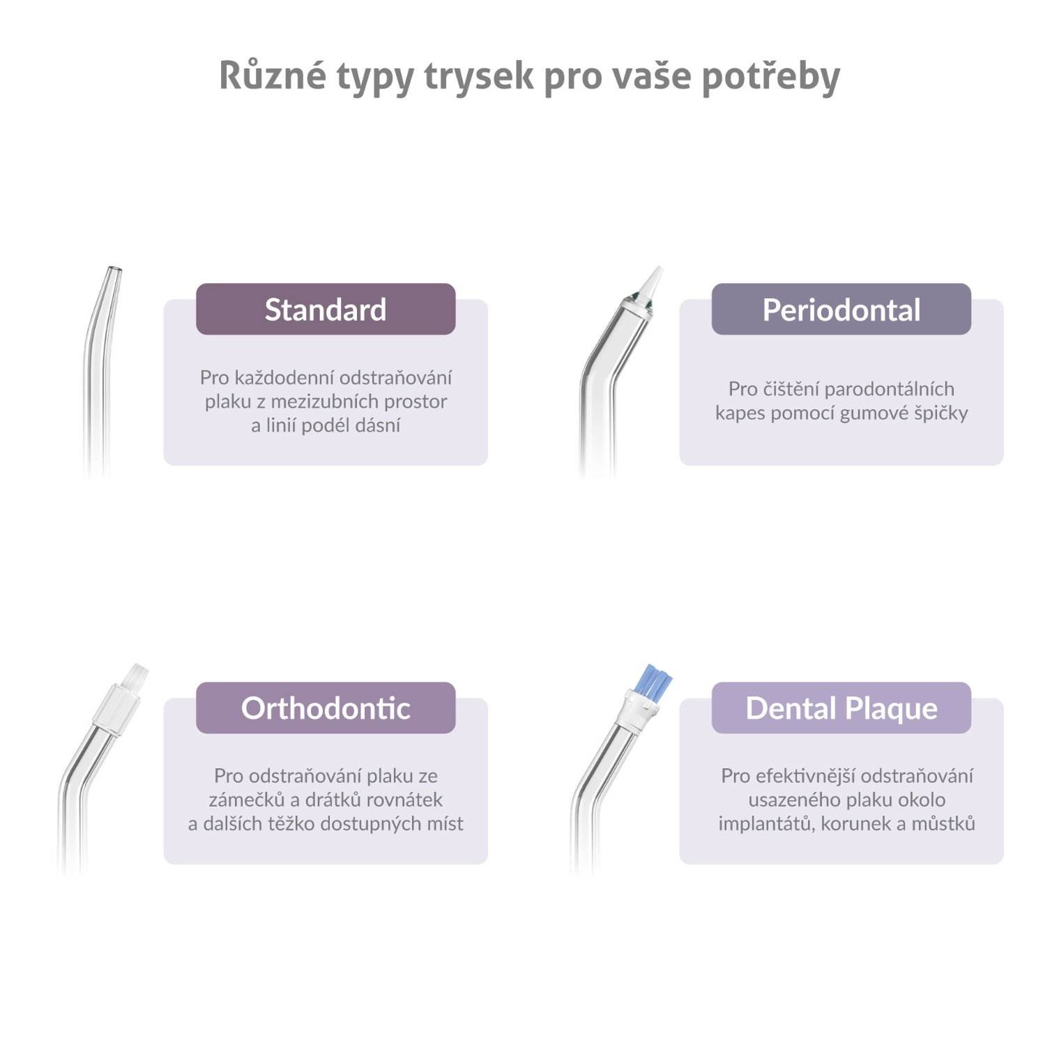 - Orthodontic – Ortodontická tryska pro odstraňování plaku ze zámečků a drátků rovnátek a dalších těžko dostupných míst