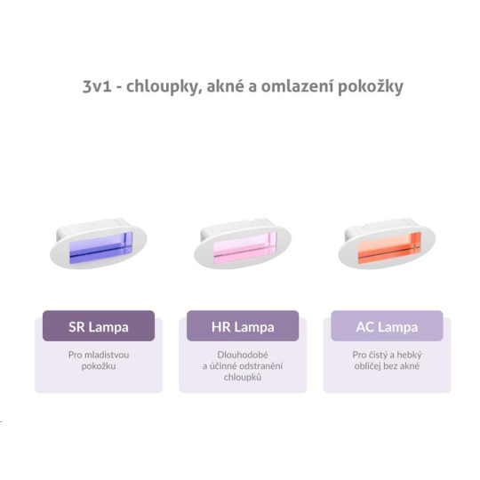 Epilátor TrueLife BELLE IPL E5 využijete kromě samotné epilace i k dalším aplikacím. Stačí pouze vyměnit lampu. K dlouhodobému a účinnému odstranění chloupků vám poslouží HR lampa, Nejednoho člověka trápí akné. Pokud chce mít obličej čistý a hebký na dotek, doporučujeme použít AC lampu. Pokud chcete svoji pokožku omladit, pomůže vám s tím SR lampa. Všechny lampy jsou součástí balení. Nemusíte si tedy nic dokupovat. Určitě oceníte i praktický stojánek.