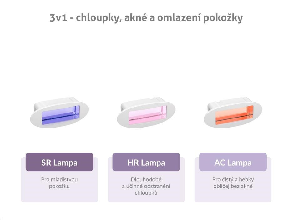 Epilátor TrueLife BELLE IPL E5 využijete kromě samotné epilace i k dalším aplikacím. Stačí pouze vyměnit lampu. K dlouhodobému a účinnému odstranění chloupků vám poslouží HR lampa, Nejednoho člověka trápí akné. Pokud chce mít obličej čistý a hebký na dotek, doporučujeme použít AC lampu. Pokud chcete svoji pokožku omladit, pomůže vám s tím SR lampa. Všechny lampy jsou součástí balení. Nemusíte si tedy nic dokupovat. Určitě oceníte i praktický stojánek.