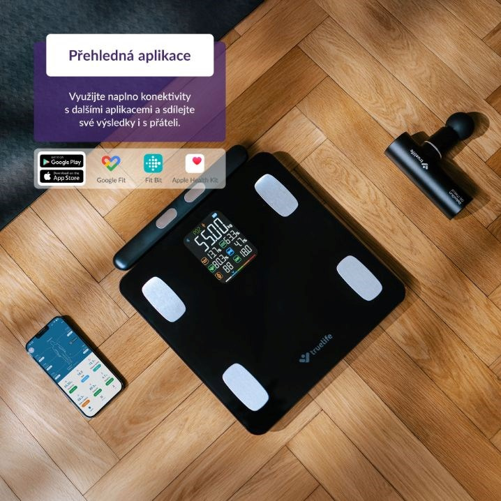 TrueLife FitScale W8 BT Black pomocí Bluetooth snadno propojíte s aplikací, která je kompletně v češtině, přináší řadu výhod a rozšiřuje možnosti osobní váhy. Během vážení se údaje automaticky s aplikací synchronizují, a to až pro 16 uživatelů. Přehledný report pak nabízí 15 indexů těla s detailním vysvětlením a doporučením týkajícím se stravy a cvičení, jak postupovat k vytyčenému cíli. Z 15 posledních měření vytvoří aplikace i grafy a statistiky, aby byl vývoj zřetelnější. Data lze synchronizovat také s aplikacemi Moving life, Apple Health, Google Fit a Fitbit.