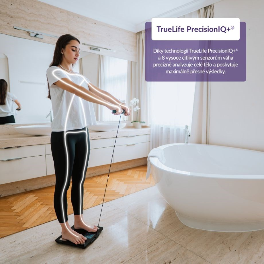 Zjistěte o svém těle více než jen pouhou hmotnost. Každý jsme originál a jedinečnou skladbu má i naše tělo, proto o něm chytrá váha TrueLife FitScale W8 BT Black prozradí detaily. Technologie TrueLife PrecisionIQ+® využívá 8 vysoce citlivých senzorů a s pomocí bioelektrické impedanční analýzy změří celkovou tělesnou kompozici. Na přehledném barevném LCD displeji zobrazí celkem 7 údajů - kromě hmotnosti také třeba procento tuku, svalů či vody. Propojením přes Bluetooth s aplikací získáte přehledný report zahrnující 15 tělesných indexů včetně jejich popisu. Váha je schopna sledovat až 16 uživatelů, u kterých v aplikaci zaznamená 15 posledních měření. Každého uživatele automaticky rozezná, takže není třeba nic přepínat. Kdokoliv má však možnost použít váhu i bez aplikace. Prémiové tvrzené krycí sklo je elegantní a velmi odolné s nosností až 180 kg. Při vážení si můžete zvolit jednotky, a to buď kilogramy nebo libry. Vážící odchylka činí pouhých 0,1 kg, takže vaše výsledky budou opravdu přesné.