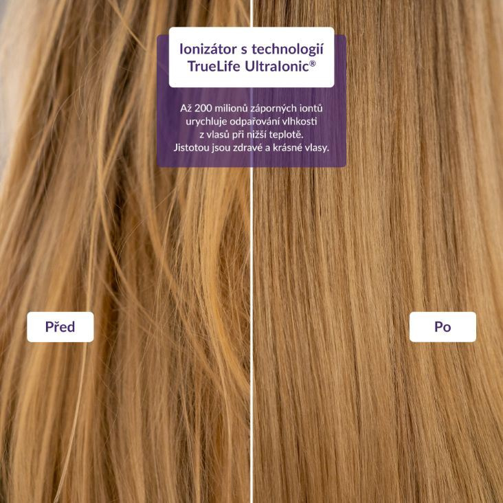 Dopřejte svým vlasům tu nejlepší péči, fén s ionizátorem TrueLife HairDryer D6 jim poskytne profesionální ošetření v pohodlí vašeho domova. Jeho super rychlý motor s technologií TrueLife UltraFlow® se pyšní výkonem až 110 000 otáček za minutu. Ionizátor s technologií TrueLife UltraIonic® generuje okolo 200 milionů záporných iontů, které pomáhají k hladším a také zdravějším vlasům, vysoušení je totiž šetrnější a rychlejší. Aktuálně zvolenou teplotu indikuje barevný LED kroužek, přičemž na výběr máte ze 3 stupňů či módu pro střídání studeného a horkého vzduchu, rovněž lze zvolit ze 2 rychlostí vysoušení. Dokonalý styling podpoří přiložený magnetický koncentrační nástavec. Konec přesušeným a poškozeným vlasům díky technologii TrueLife ConstantHeat® během sušení nekolísá teplota. Fén pracuje velmi tiše, bezpečnost zajišťuje ochrana proti přehřátí a ani údržba vás nemusí trápit, odnímatelný prachový filtr snadno odšroubujete a vyčistíte.