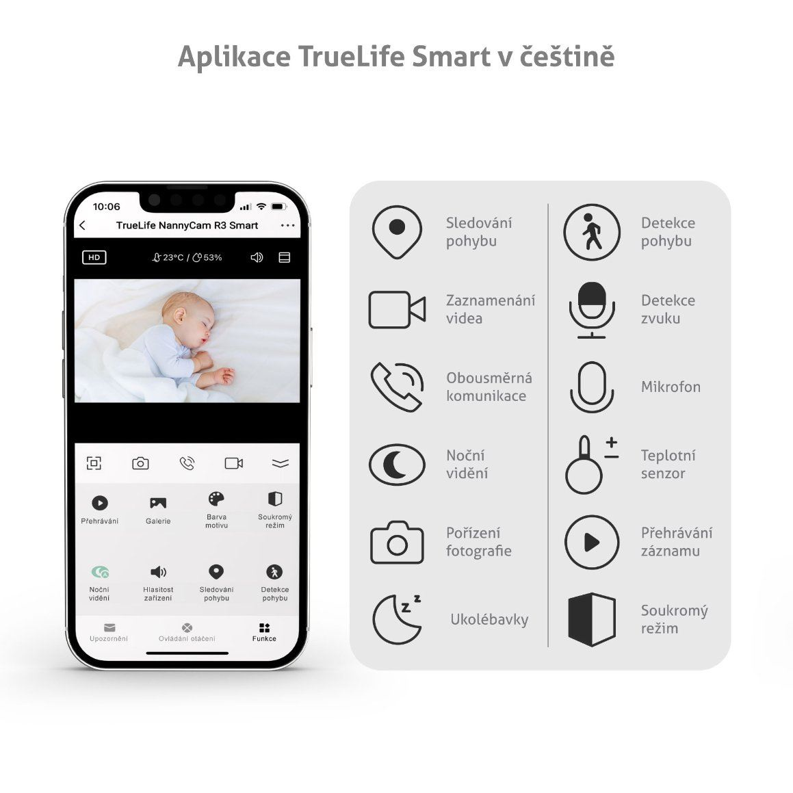 Prostřednictvím aplikace TrueLife Smart si chůvičku TrueLife NannyCam R3 Smart nastavíte přesně dle potřeb svých i dítěte. Pro váš klid zaznamenává inteligentní detektor zvuk, pohyb i teplotu a v případě změn obdržíte upozornění na svůj telefon. Děťátku chůvička poskytuje zklidnění v podobě ukolébavek, a dokonce dokáže napodobit tlukot srdce. Reaguje-li dítě spíše na váš hlas, můžete s ním komunikovat díky obousměrné komunikaci. Tuto funkci jistě oceníte i u starších dětí.