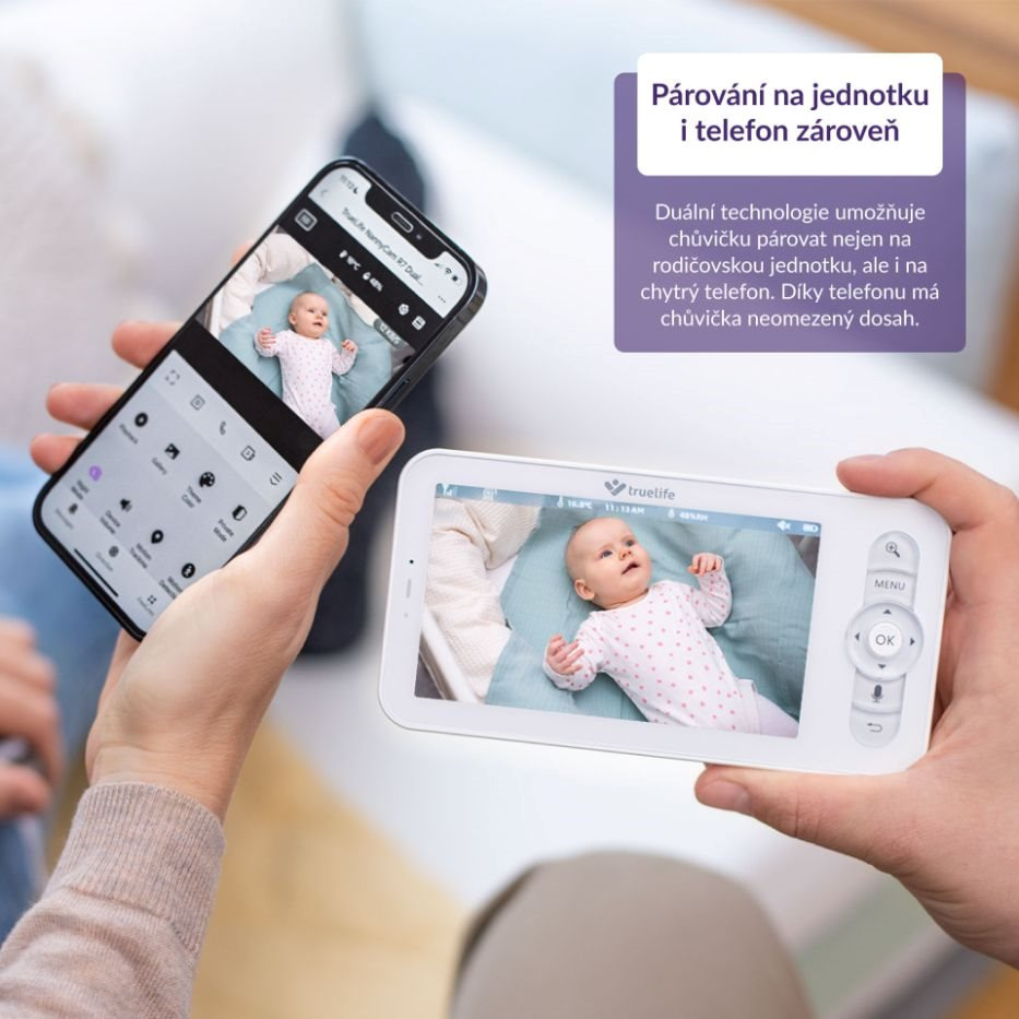 Prostřednictvím duální technologie lze chůvičku párovat na rodičovskou jednotku i chytrý telefon. Chůvičku tedy lze použít v prostředí domova s rodičovskou jednotkou. Pokud je pro vás ale zrovna pohodlnější sledovat dítě odjinud, díky aplikaci TrueLife Smart, která je kompletně v českém jazyce, získáte neomezený dosah a v aplikaci tak můžete vše sledovat odkudkoliv. Praktické je sdílení účtu s více členy domácnosti, kdy má o dítěti přehled i partner nebo třeba prarodiče. Počet uživatelů není omezen. Nemusíte se však bát nepovolaných pozorovatelů. Aplikace využívá pětivrstvé šifrovací technologie zajišťující bezpečnost chytrých zařízení, aniž by hrozil únik informací.
