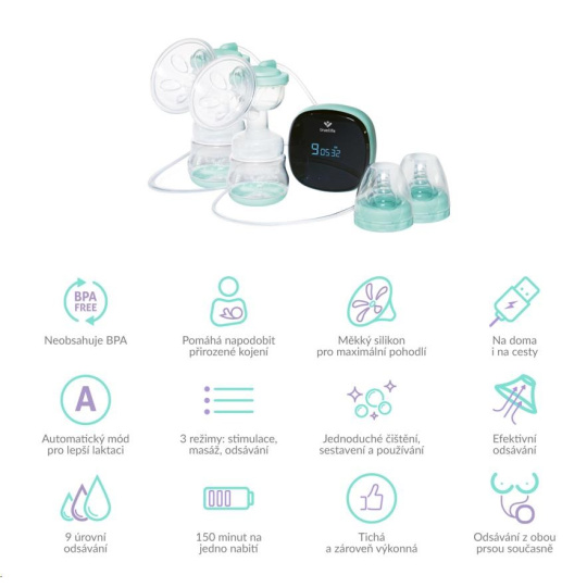 Odsávačku tvoří jen několik částí, složíte jí velmi snadno, je lehká a bez problému se vám vejde třeba do přebalovací tašky. Můžete ji s sebou vzít kamkoliv. Na jedno nabití vydrží odsávačka 150 minut provozu, součástí balení je i adaptér pro připojení do sítě. Odsávačka včetně jemného silikonového nástavce s pružným lemem je vyrobena ze 100 % zdravotně nezávadného plastu bez chemické sloučeniny BPA. Ovládání odsávačky je intuitivní a osvojíte si jej během pár minut. Odsávačka Nutrio BP Electric Double je ideálním pomocníkem pro maminky, které chtějí sobě i svému dítěti dopřát komfort a pohodlí i na cestách.