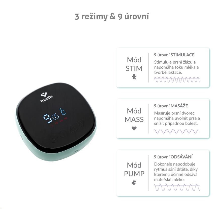 V každém ze tří módů - sání, stimulace, masáž máte na výběr z devíti úrovní. Díky tomu si můžete nastavit intenzitu odsávání tak, aby vám to bylo příjemné.