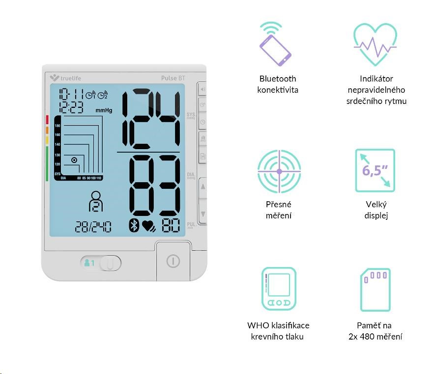 Tlakoměr TrueLife Pulse BT je opatřen přehledným displejem o nadprůměrné velikosti 6,5“ a s barevným podsvícením. Displej zobrazuje všechny důležité hodnoty a zapnuté funkce, včetně data a času. Naměřené hodnoty vám displej zobrazí během chvilky a v přehledném grafu. Tlakoměr umožňuje nastavení alarmu, který vám připomene čas na měření.