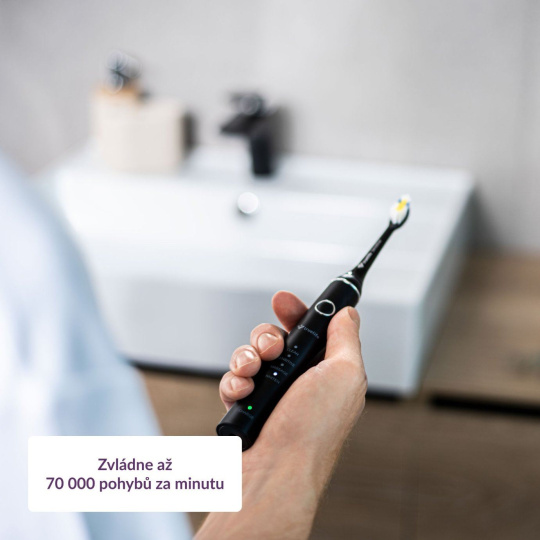 Kartáček pracuje na bázi kmitání a vibrací o frekvenci 70 000 pohybů za minutu a odstraňuje maximum zubního plaku.