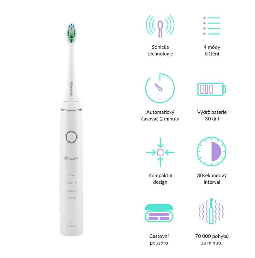 Zdravé zuby a dásně? Spolehněte se i vy na kartáček s moderní sonickou technologií TrueLife SonichBrush Compact. Díky jeho péči získáte zářivý úsměv a nedáte šanci škodlivým bakteriím. Hlava kartáčku kmitá vysokou frekvencí a každým pohybem odstraní maximum zubního plaku. Můžete vybírat ze 4 režimů čištění. Baterie vydrží celých 30 dní. Balení obsahuje sonický kartáček, dobíjecí stanici, dvě hlavice Standard a cestovní pouzdro (od roku 2021).