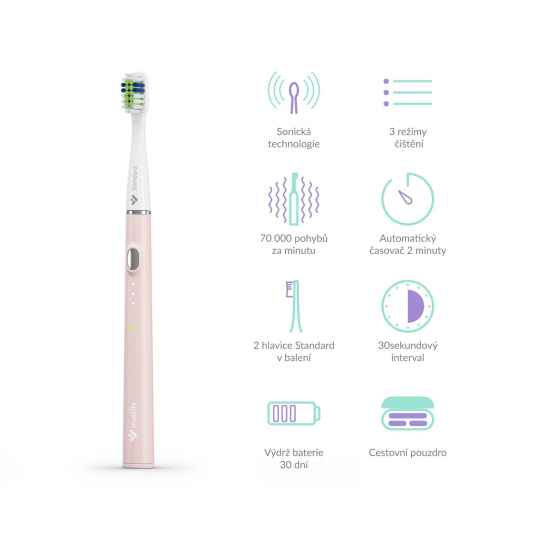 TrueLife SonicBrush Slim20 disponuje sonickou technologií SonicTrue ®, která efektivně a zároveň šetrně pomocí jemných vibrací bojuje proti zubnímu plaku. Hlava kartáčku kmitá rychlostí až 70 000 pohybů za minutu a vířením vody se zubní pastou dochází k čištění i mezizubních a hůře dostupných prostor. Balení obsahuje hned 2 čisticí hlavice, z nichž každá vydrží až 3 měsíce používání. Moment pro její výměnu indikují speciální modré štětiny, které postupně blednou. Máte tak jistotu, že se nesníží účinnost čištění.