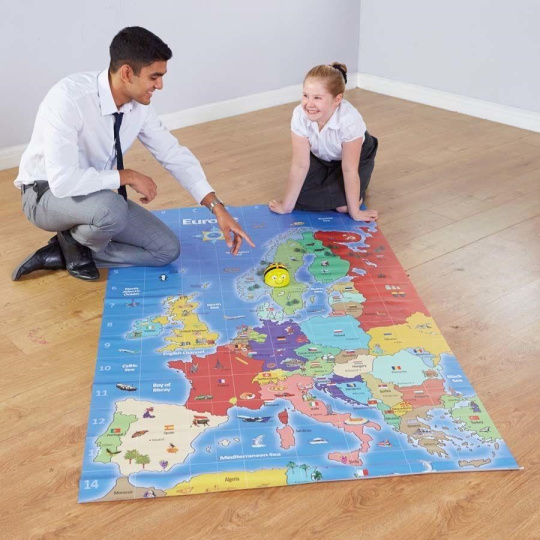 Bee-Bot & Blue-Bot podložka Evropy. Cestujte po Evropě a objevujte zákoutí, které jste ještě nevěděli se svým Bee-Botem Včekou nebo Blue-Botem Beruškou a touto fantastickou podložkou mapy Evropy. Děti se budou bavit a dozví se o evropských státech s touto detailní a pestrou vinylovou mapou. Podložka má po stranách otvory na přichycení na zeď, můžete jí použít nejen jako podložku pro Bee-Bota a Blue-Bota, ale také jako závěsnou mapu na zeď. Podložka je vyrobená z vinylu a PVC a může se používat také v exteriéru.