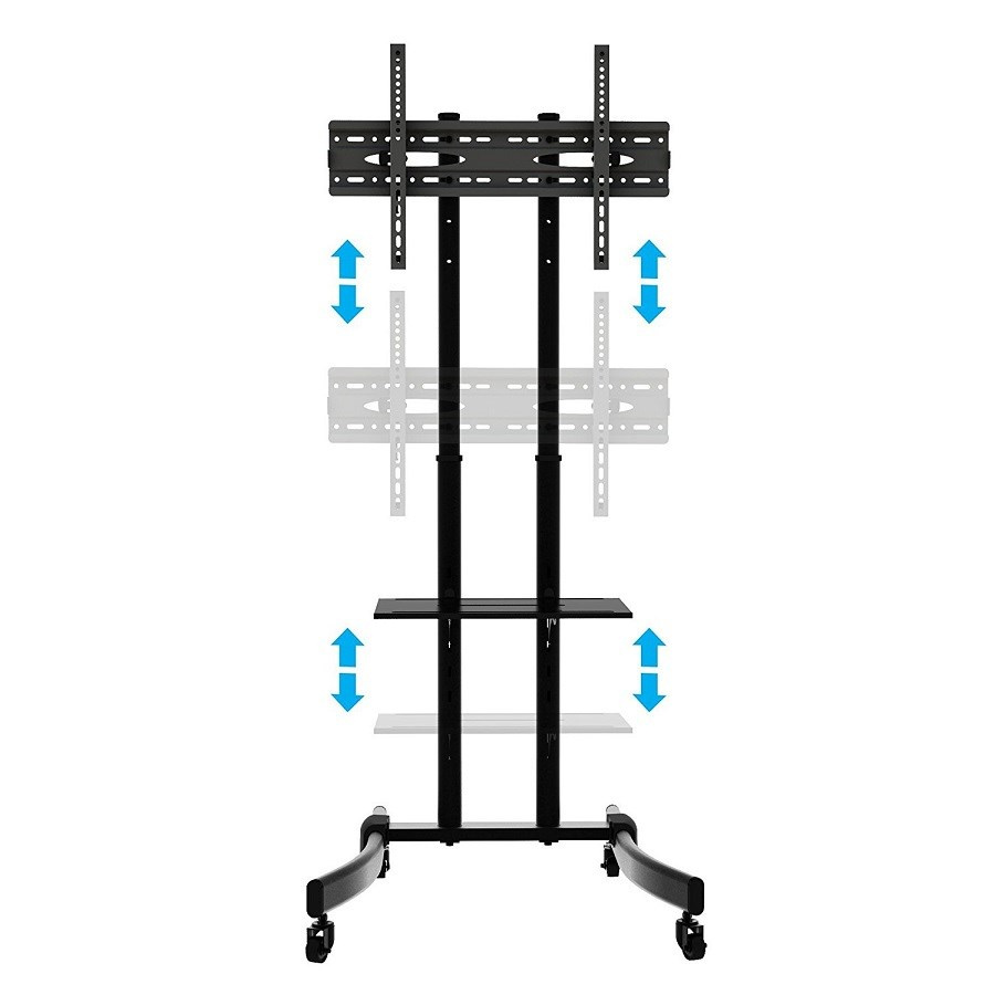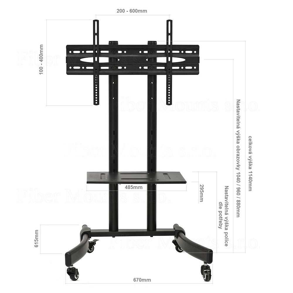 Podlahový stojan na Tv pojízdný Fiber Mounts M7C39 Podlahový pojízdný stojan na televize 32" až 65", nastavitelná výška televize 89/96/114cm, polička 485x295mm, pojízdný, VESA 200x100 až 600x400, nosnost 40kg Pěkný stojan na televize s úhlopříčkou 32-65". Stojan má pevnou robustní konstrukci, zavěšení televize je spolehlivé a bezpečné. Díky kolečkům je manipulace se stojanem snadná a pohodlná, aretace zajistí stojan na místě. Stojan dodáváme včetně poličky na příslušenství, na kterou můžete dát notebook, počítač, herní konzoli nebo přehrávač. Konstrukce umožňuje 3 výškové polohy obrazovky, stejně tak můžete upravit i výšku poličky. Držák podporuje VESA standardy 200x100 až 600x400 pro uchycení televize. Nosnost stojanu je 40kg. Záruka 5 let. Podlahový pojízdný stojan na televizi Fiber Mounts M7C39 Technické údaje: nosnost 40kg na televize a monitory s úhlopříčkou 32" až 65" podporuje VESA standardy 200x100 až 600x400 celková výška stojanu bez obrazovky 1140mm výškové nastavení obrazovky 880 / 960 / 1040mm (výška po střed obrazovky) polička na příslušenství 485x295mm nastavení výšky poličky pojezdová kolečka s aretací pevná konstrukce vynikající stabilita a bezpečnost barevné provedení černé záruka 5 let Pojízdný stojan s nastavením výšky televize a výšky poličky Fiber Mounts M7C39 Televizní stojan M7C39 podporuje VESA standardy: VESA 200x100 VESA 200x200 VESA 300x200 a 200x300 VESA 300x300 VESA 400x200 a 200x400 VESA 400x300 a 300x400 VESA 400x400 VESA 600x400.