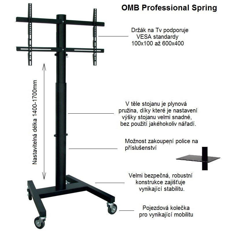 Tv stojan OMB Professional Spring Televizní stojan s plynovou pružinou pro snadné a rychlé nastavení výšky 140-170cm bez nářadí, nosnost 40kg, VESA 100x100 až 600x400, na televizory a monitory 32" až 65" Profesionální stojan robustní, velmi pevné, bezpečné a stabilní konstrukce, který má uvnitř nosníku integrovanou plynovou pružinu pro možnost velmi snadného nastavení výšky obrazovky bez nutnosti použití jakéhokoliv nářadí, navíc neskutečně rychle a pohodlně. Plynová pružina zajistí po stlačení bezpečnostní páčky plynulé vyjetí obrazovky do horní pozice, v případě potřeby snížit výšku stačí zatlačit na obrazovku. Regulovat výšku je možné v rozmezí 140cm až 170cm (výška stojanu po střed obrazovky). Stojan je ideální na televizory a monitory s hmotností do 40kg, které podporují jakýkoliv VESA standard v rozmezí 100x100 až 600x400mm včetně. Doporučená úhlopříčka je 32" až 65", ale je možné použít i větší obrazovky až do úhlopříčky 65". Podstavec stojanu je osazen kvalitními pojezdovými kolečky, které zajišťují vynikající mobilitu. Televizní stojan OMB Professional Spring dodáváme v černém provedení. Televizní stojan s nastavením výšky a kolečky OMB Professional Spring Technické údaje: max. zatížení 40kg podpora VESA standardu 100x100 až 600x400 doporučená úhlopříčka zavěšené obrazovky 32" až 65" nastavitelná výška stojanu v rozmezí 1400 až 1700mm integrovaná plynová pružina pro snadné a rychlé nastavení výšky bez použití nářadí možnost dokoupení police na příslušenství OMB Shelf Handy s rozměry 447x300mm nosnost police na příšlušenství 5kg robustní, velmi pevná konstrukce profesionální kvalita bezpečný, stabilní stojan barevné provedení černé záruka 3 roky Televizní stojan s plynovou pružinou pro snadné a rychlé nastavení výšky v rozmezí 140 až 170cm, nosnost 40kg, VESA standard 100x100 až 600x400 - OMB Professional Spring Televizní stojan OMB Professional Spring podporuje VESA standardy: VESA 100x100 VESA 200x100 VESA 200x200 VESA 300x200 VESA 300x300 VESA 400x200 VESA 400x300 VESA 400x400 VESA 600x400 Na Tv stojan je možné zavěsit všechny typy televizorů a monitorů, které mají hmotnost do 40kg a podporují kterýkoliv z výše uvedených VESA standardů. Velikost televizoru není podstatná, pouze doporučujeme minimální úhlopříčku 32", ideálně 37" a větší. Na televizní stojan OMB Professional Spring je možné dokoupit polici na příslušenství OMB Shelf Handy s nosností 5kg: Police na příslušenství ke stojanu OMB Professional Spring - OMB Shelf Spring Díky vynikajícímu řešení nastavitelné výšky pomocí plynové pružiny zvládne nastavování výšky bez jakéhokoliv nářadí a námahy kdokoliv. Stojan je ideální pro využití na prezentacích, výstavách, přednáškách, konferencích, čekárnách a kdekoliv pro komerční i nekomerční účely..
