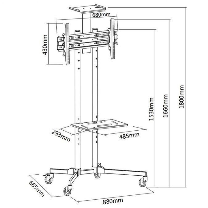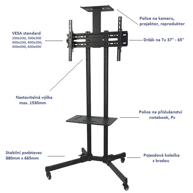 Tv stojan s policemi Fiber Mounts M6C61 Stojan na televize 37-65", nastavení výšky max. 153cm, polička na příslušenství a na kameru, kolečka s brzdou, VESA 200x100 až 600x400, nosnost 50kg Kvalitní podlahový stojan na Tv 37-65" s pojezdovými kolečky s aretací a poličkami na příslušenství a na kameru. Stojan umožňuje nastavit výšku televize a výšku polic. Systém pro vedení kabelů. Podpora VESA standardů 200x100 až 600x400, nosnost 50kg. Barevné provedení černé, záruka 3 roky. Televizní stojan s policemi na příslušenství a na kameru Fiber Mounts M6C61 Technické údaje: nosnost 50kg podporuje VESA standardy 200x100 až 600x400 na televize a monitory s úhlopříčkou 37" až 65" nastavení výšky televize, max. 153cm polička na příslušenství 485x293mm s nastavením výšky, nosnost 5kg polička na kameru, nosnost 3,5kg pojezdová kolečka s brzdou systém pro vedení kabelů kvalitní konstrukce barevné provedení černé záruka 3 roky Tv stojan s poličkami a kolečky Fiber Mounts M6C61 Televizní stojan Fiber Mounts M6C61 podporuje VESA standardy: VESA 200x100 VESA 200x200 VESA 300x200 a 200x300 VESA 300x300 VESA 400x200 a 200x400 VESA 400x300 a 300x400 VESA 400x400 VESA 600x400.