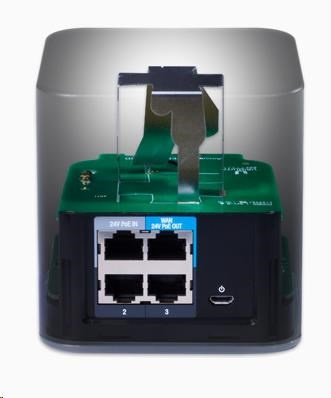Napájení routeru je možné řešit jak přes napájecí adaptér, který není součástí balení, tak i pomocí 24V pasivního injektoru zapojeného do portu LAN, čímž bude možné napájet i venkovní jednotku jako např.: Loco, PowerBeam, NanoBeam a jiné klientské jednotky.