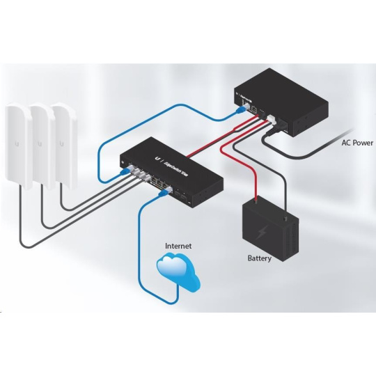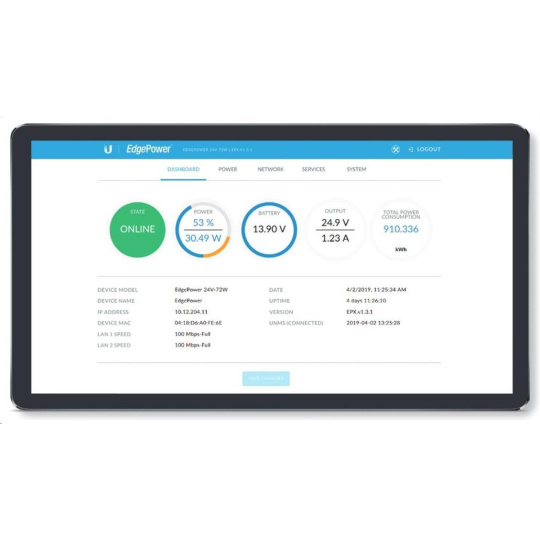 Pro připojení napájených zařízení jsou k dispozici 2 ethernetové porty s možností pasivního 54V PoE Out, rychlostí 100Mbps a 1 výstup na svorkovnici. EdgePower je možné spravovat přes aplikaci UNMS nebo ve vlastním webovém rozhraní. Samozřejmostí je podpora protokolu SNMP.