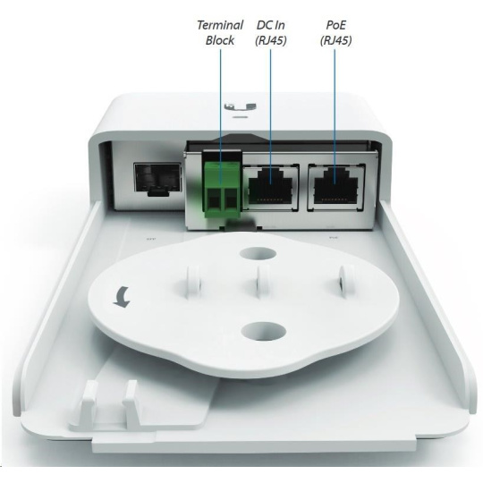 FiberPOE obsahuje 2 ethernetové porty, 1 SFP slot a DC svorkovnici. Pro napájení převodníku jsou celkem 3 možnosti: první je DC svorkovnice, druhá a třetí je přes RJ45 porty. Převodník lze tedy napájet z obou ethernetových portů, nicméně data přenáší pouze port označený jako POE. Všechny 3 možnosti pracují v rozsahu 16 až 50V DC.