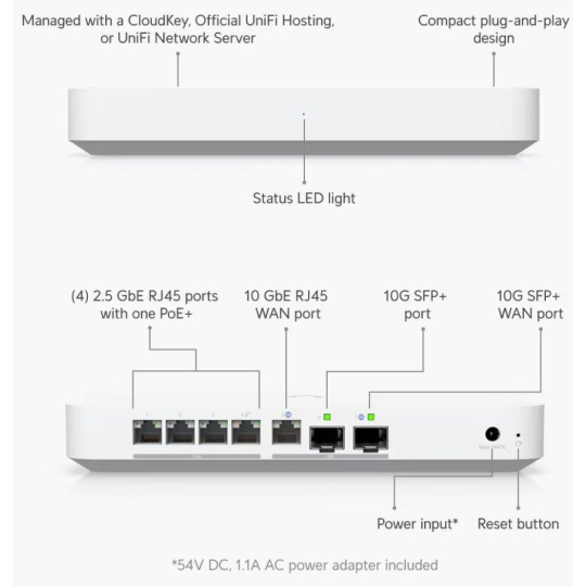 Popis produktu UXG-Fiber je kompaktní 10 gigabitový router, který disponuje (1) WAN 10Gbps portem, (2) 10Gbps SFP+ porty (1x WAN, 1x LAN) a (4) LAN 1/2.5Gbps porty s jedním PoE-OUT portem s podporou PoE+ 802.3af/at. Kompaktní, ale výkonné provedení tak podporuje funkci multi-WAN včetně možnosti load balancing, nechybí podpora IDS/IPS. Router má implementovanou podporu různých typů VPN, včetně site-to-site VPN. Napájení je řešeno prostřednictvím napájecího adaptéru 54V/1,1A, napájecí adaptér je součástí balení. Klíčové vlastnosti • 5Gbps routing s podporou IDS/IPS • (1) WAN 10Gbps + (1) 10Gbps SFP+ WAN • (4) 2.5Gbps LAN + (1) 10Gbps SFP+ • Multi-WAN + load balancing • Podpora VPN, včetně site-to-site VPN Obsah balení • Zařízení • Patch kabel • Napájecí adaptér 54V/1,1A Technické parametry Konektory a rozhraní Rychlosti WAN:(1) 1/2.5/10Gbps + (1) 10Gbps SFP+ Možnost více WAN:Ano Rychlost LAN:(4) 10/100/1000/2500Mbps Gigabit LAN:Ano Optické rozhraní:(2) 10Gbps Napájení Typ napájení:DC konektor Typy PoE:PoE-Out (pouze) Podporované PoE-Out standardy:802.3af, 802.3at Počet PoE Out portů:1 Max. spotřeba energie [W]:25 Napájení přes konektor/svorkovnici:54V / 1,1A Fyzické charakteristiky Provedení:Desktop Šasi:Plastové Tlačítka:Reset Provozní teplota [°C]:0 až 40 Hmotnost [g]:605 Šířka [mm]:213 Výška [mm]:30 Hloubka [mm]:128 Hardware CPU:ARM Cortex-A73 Frekvence CPU [MHz]:2200 Počet CPU jader:4 RAM [MB]:2048 Software Podporované VPN:L2TP, IPSec, OpenVPN, WireGuard Management:UniFi Network Podpora IPv6:Ano.