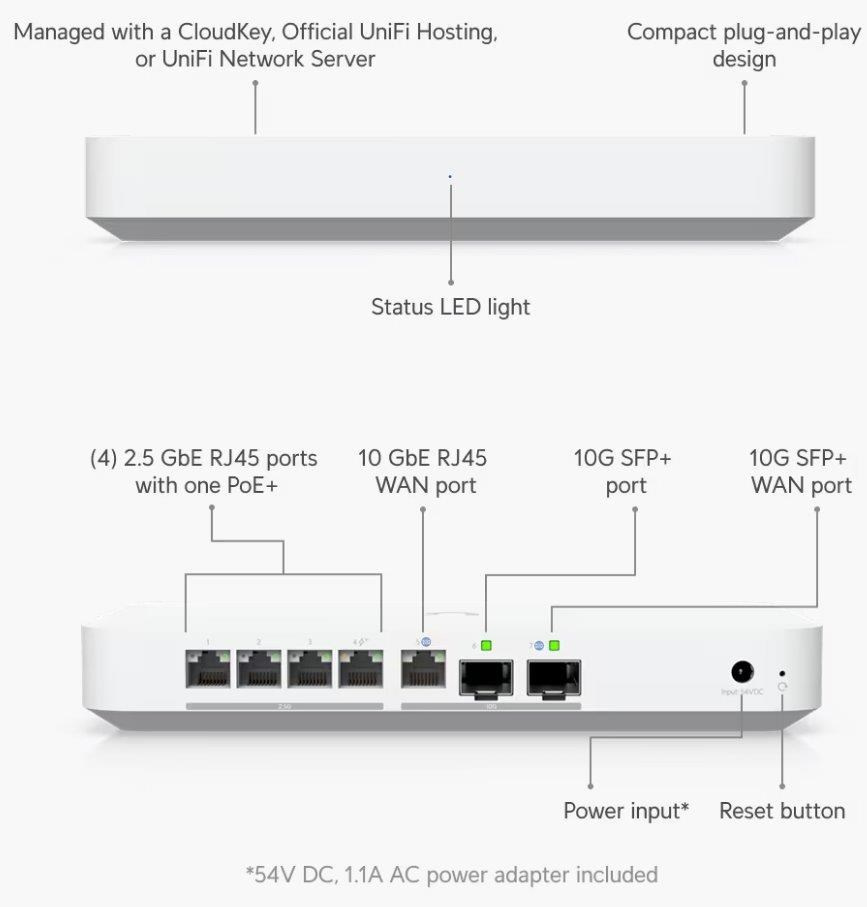 Popis produktu UXG-Fiber je kompaktní 10 gigabitový router, který disponuje (1) WAN 10Gbps portem, (2) 10Gbps SFP+ porty (1x WAN, 1x LAN) a (4) LAN 1/2.5Gbps porty s jedním PoE-OUT portem s podporou PoE+ 802.3af/at. Kompaktní, ale výkonné provedení tak podporuje funkci multi-WAN včetně možnosti load balancing, nechybí podpora IDS/IPS. Router má implementovanou podporu různých typů VPN, včetně site-to-site VPN. Napájení je řešeno prostřednictvím napájecího adaptéru 54V/1,1A, napájecí adaptér je součástí balení. Klíčové vlastnosti • 5Gbps routing s podporou IDS/IPS • (1) WAN 10Gbps + (1) 10Gbps SFP+ WAN • (4) 2.5Gbps LAN + (1) 10Gbps SFP+ • Multi-WAN + load balancing • Podpora VPN, včetně site-to-site VPN Obsah balení • Zařízení • Patch kabel • Napájecí adaptér 54V/1,1A Technické parametry Konektory a rozhraní Rychlosti WAN:(1) 1/2.5/10Gbps + (1) 10Gbps SFP+ Možnost více WAN:Ano Rychlost LAN:(4) 10/100/1000/2500Mbps Gigabit LAN:Ano Optické rozhraní:(2) 10Gbps Napájení Typ napájení:DC konektor Typy PoE:PoE-Out (pouze) Podporované PoE-Out standardy:802.3af, 802.3at Počet PoE Out portů:1 Max. spotřeba energie [W]:25 Napájení přes konektor/svorkovnici:54V / 1,1A Fyzické charakteristiky Provedení:Desktop Šasi:Plastové Tlačítka:Reset Provozní teplota [°C]:0 až 40 Hmotnost [g]:605 Šířka [mm]:213 Výška [mm]:30 Hloubka [mm]:128 Hardware CPU:ARM Cortex-A73 Frekvence CPU [MHz]:2200 Počet CPU jader:4 RAM [MB]:2048 Software Podporované VPN:L2TP, IPSec, OpenVPN, WireGuard Management:UniFi Network Podpora IPv6:Ano.