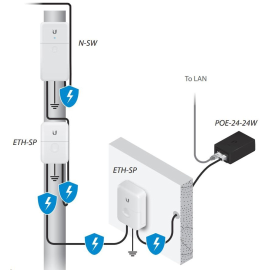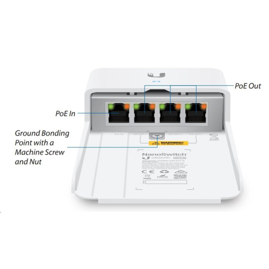 Zbylé 3 porty slouží pro napájení dalších zařízení s podporou 24V pasivního Gigabit PoE s podporou napájení po 2 párech (standard pro zařízení typu NanoStation, PowerBeam, AirGrid atd.). Switch dokáže dodat max. 24W v součtu na všechny tři výstupní PoE porty.