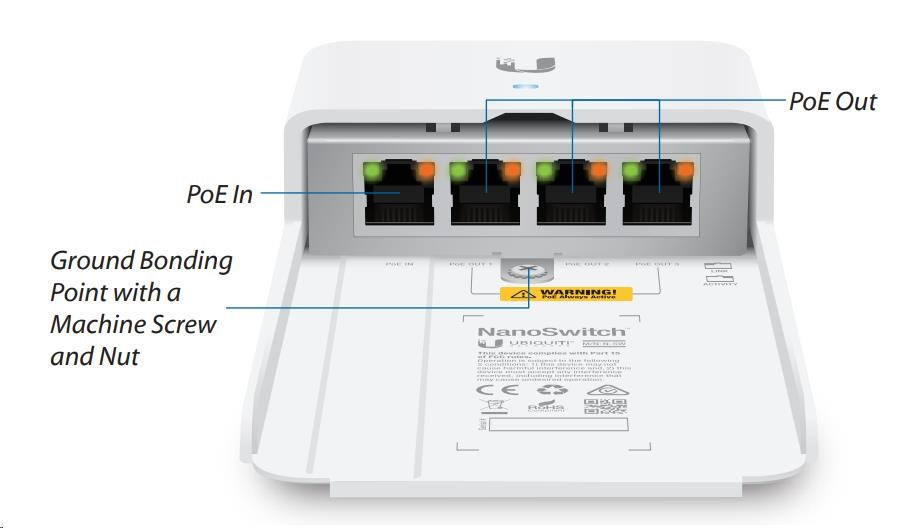 Zbylé 3 porty slouží pro napájení dalších zařízení s podporou 24V pasivního Gigabit PoE s podporou napájení po 2 párech (standard pro zařízení typu NanoStation, PowerBeam, AirGrid atd.). Switch dokáže dodat max. 24W v součtu na všechny tři výstupní PoE porty.