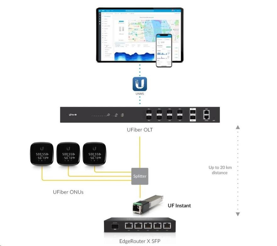 UF-Instant je GPON SFP modul s jedním SC konektorem a je určený do Ubiquiti jednotek řady EdgeSwitch, EdgeRouter, UniFi Switch a USG nebo s produkty UF-AE a F-POE-G2. Modul je určený pro trasy dlouhé až 20km a je schopen komunikovat s OLT jednotkou asymetrickou rychlostí 2.4Gbps download a 1.2Gbps upload.