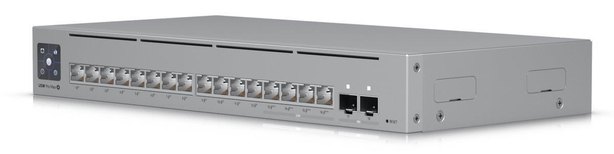 Popis produktu Ubiquiti Pro Max 16-PoE je novým L3 switchem, který nabízí 4x 2.5 Gbps porty s PoE++ až 60W a 12x 1 Gbps porty s PoE+. Celkový PoE budget je 180 W. Pro připojení pomocí optického rozhraní jsou připraveny 2 SFP+ porty dosahující rychlosti až 10 Gb/s. Switch je napájen DC adaptérem 54V DC 210W. Upozornění:pro montáž do racku je nutné dokoupit příslušenství Ubiquiti Pro Max 16 Rack Mount. Etherlighting technologie Switch podporuje technologii Etherlighting, která umožňuje barevně indikovat lokaci portu, linkovou rychlost, nadefinované typy zařízení, PoE status nebo barevně odlišit jednotlivé VLAN. Správa přes UniFi Controller Switch nemá webový management, ale je spravován centrálně pomocí UniFi Controlleru s podporou mobilní aplikace UniFi a nabízí rozsáhlou sadu pokročilých přepínacích protokolů a funkcí L2, včetně provozního režimu (přepínání, zrcadlení nebo agregace) na port. UniFi Network Controller a mobilní aplikace umožňují správcům konfigurovat a sledovat prakticky všechny funkce přepínače v grafickém uživatelském rozhraní odkudkoli. Obsah balení • Zařízení • Napájecí DC adaptér • Montážní set Technické parametry Konektory a rozhraní Rychlost LAN:(12) 10/100/1000Mbps + (4) 10/100/2500Mbps Optické rozhraní:(2) 1G/10Gbps Ostatní:Dotykový displej Napájení Typ napájení:DC konektor Typy PoE:PoE-Out (pouze) Podporované PoE-Out standardy:802.3af, 802.3at, 802.3at - ultra PoE (60W) Počet PoE Out portů:16 PoE budget [W]:180 Max. spotřeba energie [W]:210 Napájení přes konektor/svorkovnici:54V DC Fyzické charakteristiky Provedení:Na zeď, Desktop, Rackmount Ventilátory:Ne Šasi:Kovové Tlačítka:Reset Provozní teplota [°C]:-5 až 40 Šířka [mm]:325 Výška [mm]:44 Hloubka [mm]:160 Obecné Rychlost přepínání [Gbps]:84 Rychlost předávání paketů [Mpps]:62 Software Management:UniFi Network Funkce:VLAN, DHCP snooping, L3 Výchozí IP adresa:Dynamická z DHCP.