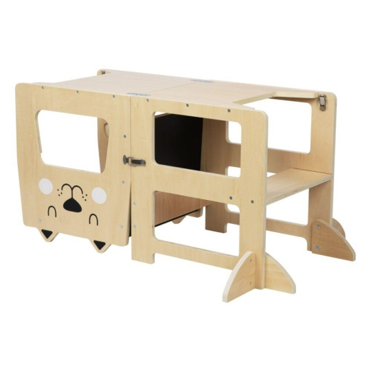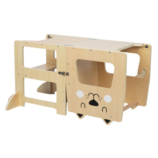 Multifunkční učící věž 4v1 je nepostradatelným pomocníkem do domácnosti s malými dětmi. Učící věž Lvíček představuje dětský nábytek i hračku v jednom a potěší holčičky i chlapce. Může být klasickou učící věží v podobě roztomilého zvířátka, může představovat schůdky, originální set dětského nábytku (dětský stolek se židličkou) a zároveň je i kreslící tabulí, na kterou si děti mohou malovat křídami.