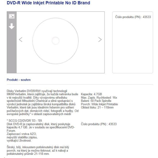 Vedle podpory nejvyšších možných rychlostí jsou média Verbatim k dispozici i s potiskovatelným povrchem. Dříve se barvy mohly zdát nejasné, vybledlé nebo odlišné od barev na předloze. Díky povrchu potiskovatelných disků Verbatim však nyní budou barvy živé a jasné jako na originálu. K dispozici jsou i disky s lesklou povrchovou úpravou. Pro dosažení dokonalých výsledků si můžete, podobně jako při tisku fotografií, vybrat buď lesklý, nebo matný povrch. K dispozici jsou dále i média s možností širokého potisku, takže obrázek může zasahovat až k středovému otvoru v disku.