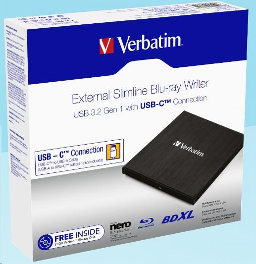 VERBATIM externí mechanika Slimline Blu-ray Writer (USB-C, USB 3.0) Zdarma BR Disc 25GB (CD DVD BD + NERO