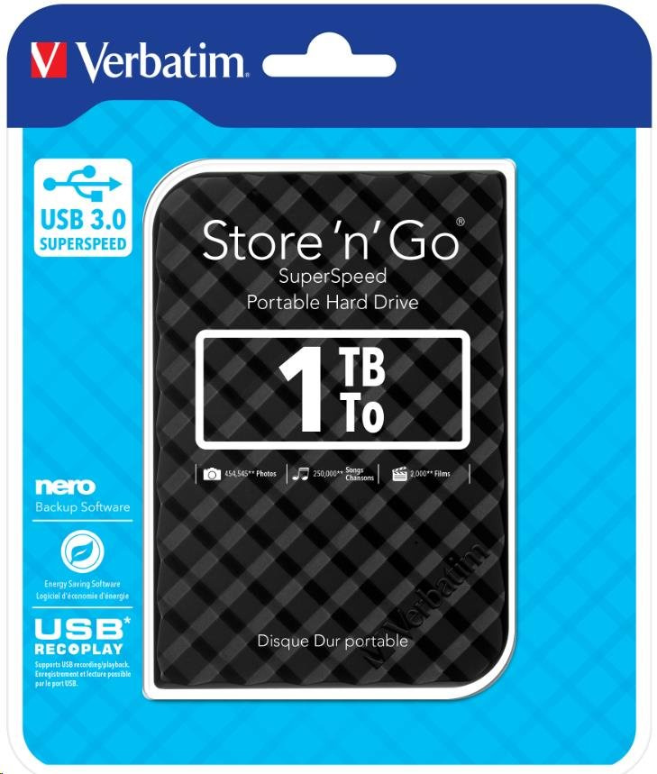 VERBATIM HDD 2.5" 1TB Store 'n' Go Portable Hard Drive USB 3.0, Black Special Features: Colours available: Black, Silver, White, Red & Blue Capacities available: 500GB, 1TB & 2TB High speed, high capacity storage. A fast & safe solution to expand storage or backup files USB 3.0 SuperSpeed - for ultra fast data transfer Nero Backup Software Energy Saving Software USB REC & PLAY* - supports USB recording/ playback 2 year limited warranty** System requirements: PC or Mac with USB 3.0 Windows XP / Vista / Windows 7 & 8 Mac OS X 10.4 or higher Pack Contents: Portable Hard Drive / USB 3.0 Cable / Nero Backup Software / Green Button Energy Saving Software / Verbatim Formatter / Quick Start Guide / User Guide (pre-loaded on the drive).