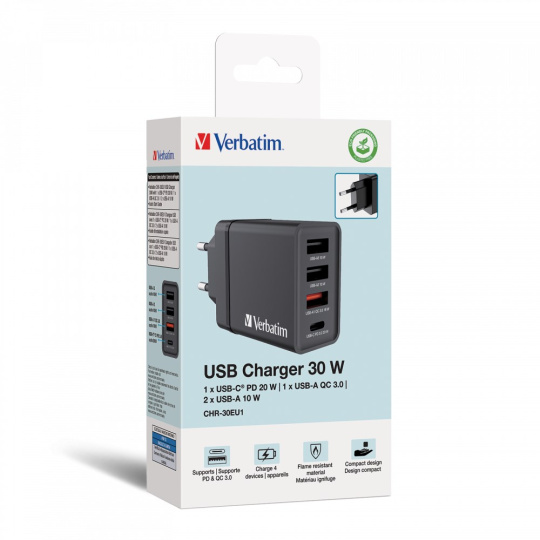 VERBATIM Univerzální adaptér nabíječka CHR-30EU2, 30W, 1x USB-C, 3x USB černá