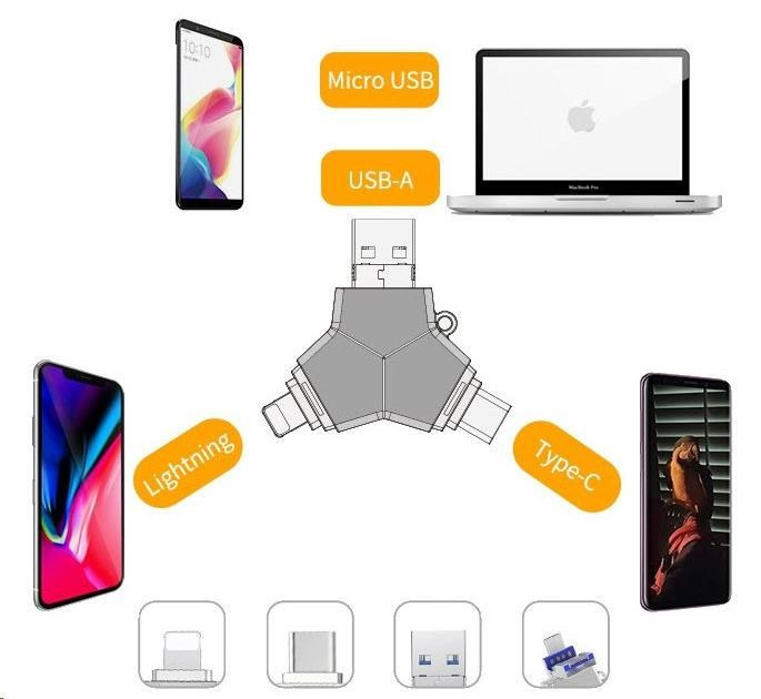 Inovativní a moderní USB FLASH DISK 4v1 s neuvěřitelně lehkým přesto odolným designem je ideálním řešením pro přenos a zálohování dat z jakéhokoliv zařízení. S podporou konektorů APPLE LIGHTNING, MICRO USB, USB-C a USB 3.0 a dostupnou interní pamětí o kapacitě 32GB, 64GB nebo 128GB, vám tento zařízení umožní rychle a spolehlivě přenášet data.