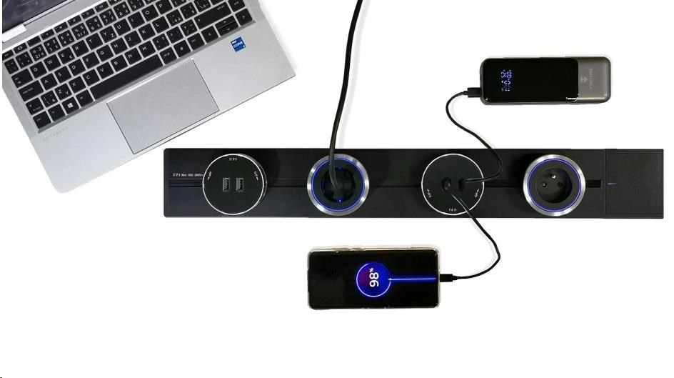 - Bezpečný a robustní design: Zásuvková lišta je vyrobena z odolné hliníkové slitiny, která zajišťuje dlouhou životnost a ochranu proti přehřátí. Těsnicí pásek chrání proti prachu a náhodnému dotyku, což snižuje možnost úrazu elektrickým proudem.